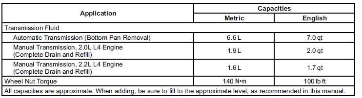 The following approximate capacities are given in metric and English conversions. Please refer to Recommended Fluids and Lubricants for more information.